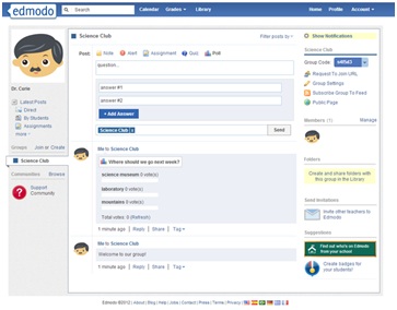 Едмодо (http:// www.edmodo.com) е онлайн интерфейс, където учителите могат да работят в групи и да организират класни стаи и занятия- извън учебната програма. Системата може да бъде използвана от целия клас или по-малки групи, създадени за лабораторни и други проекти.