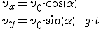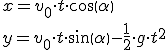 Kūnas turi pradinį greitį v0 ir kampą horizontaliai linijai ir juda gravitacijos lauke (žemės ar kitos planetos). Momentinis greitis v = (vx, vy) laiko momentu t gali būti išreikštas šiomis lygtimis:
