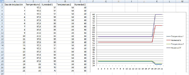 1. Temperatura y humedad antes y después de poner en marcha la incubadora y durante el proceso de incubación para comparar datos entre sí.