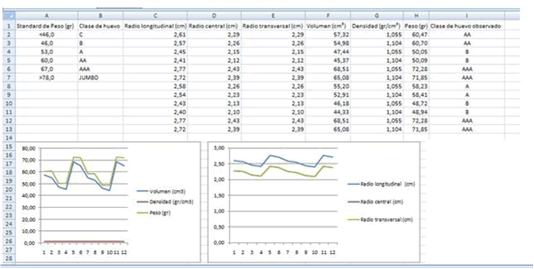 Para ello se aplicará sobre las fotografías obtenidas durante el proceso de investigación la medición de la longitud y la anchura y con ello, teniendo en cuenta que la media de densidades de los huevos está entre 1,055 - 1,104 gr/cm3 se pueden establecer varias de las medidas propuestas a continuación.