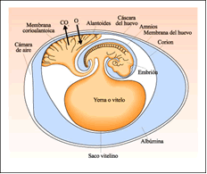 Dentro del huevo, el embrión en desarrollo queda completamente rodeado por una membrana llena de líquido, el amnios. Este líquido, el líquido amniótico, protege al embrión de la desecación y los accidentes. El huevo también lleva un rico suministro alimenticio, la yema. La yema está encerrada dentro de una membrana que está conectada directamente con el sistema digestivo del embrión. Debido a que el huevo es un sistema cerrado (no muy diferente de una nave espacial) se precisa de algún método para deshacerse de los desperdicios. Un tercer saco membranoso, el alantoides, recoge los desperdicios líquidos del embrión, separándolos completamente del resto del sistema. La superficie externa del alantoides, que tiene un abundante riego sanguíneo, también se utiliza para el intercambio de oxígeno y anhídrido carbónico. Estos dos gases se difunden hacia adentro y hacia afuera del huevo. Una cuarta membrana, el corion, se encuentra justamente debajo de la cáscara, rodeando al embrión y a todas las demás membranas. Todas estas membranas están formadas de tejido embrionario (no materno) y se desarrollan a medida que el embrión se desarrolla, como veremos más adelante.
