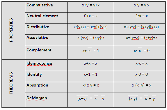 The following table summarizes the most significant properties and theorems for Boolean Algebra.