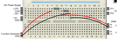How do we experiment with alternating circuits? Well, in principle, this is very easy: all we have to do is connect the resistors that make up the circuit like we do in the case of DC, use the function generator instead of the power supply (DC power) and select AC on the multimeter when measuring the voltage and current of a circuit.