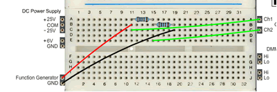 E.g.: calculate and measure the voltage drop in a circuit with two series resistances of 1K for a sinusoidal input signal of 1 KHz and 10 Vpp.