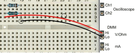 - Una vez que el circuito está montado, hay que medirlo. En este caso usaremos el multímetro (DMM: digital multimeter) para medir el valor de la resistencia total de cada montaje. Para ello hay que colocar un cable en un extremo del circuito y otro en el otro extremo (rojo y negro, generalmente), sabiendo que hay muchas formas de conectar los cables, siendo todas válidas. A la izquierda se ve cómo medir la resistencia total de un circuito serie, y a la derecha, lo propio con un circuito en paralelo.