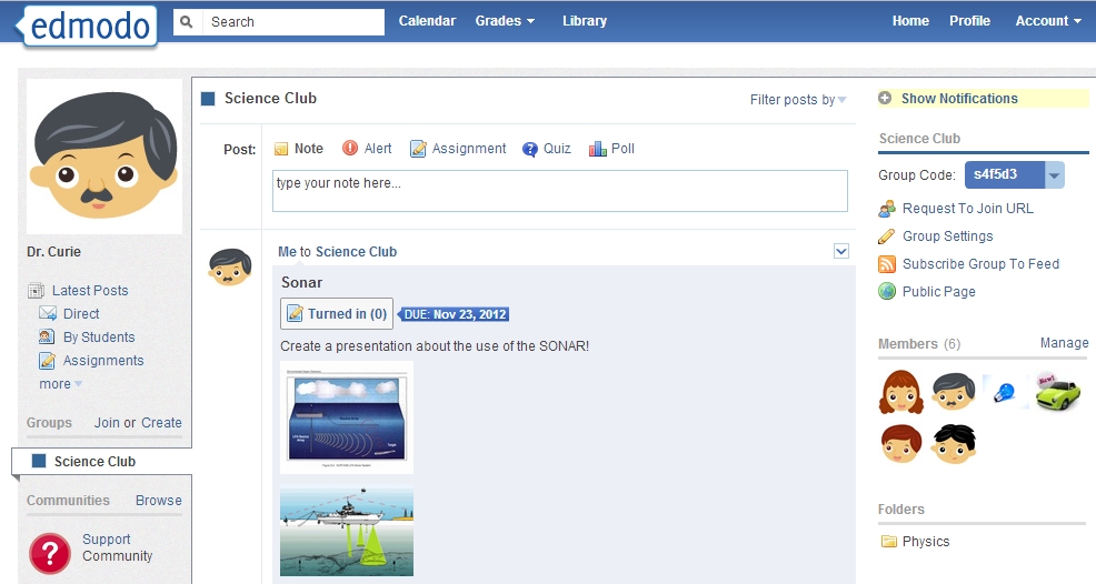 El grupo cuenta con un calendario y una biblioteca de documentos. Este último puede ser conectado al Google Drive del maestro, y los archivos individuales, también se pueden cargar.