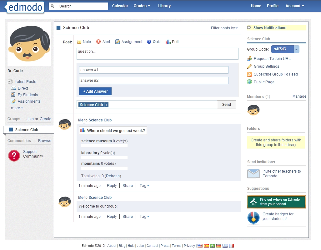 El profesor puede enviar mensajes a los estudiantes en foros del grupo inmediatamente después de que haya creado un grupo. Puede publicar notas con archivos adjuntos o enlaces. Una encuesta simple es una herramienta eficaz para mantener el interés del estudiante y en cualquier momento se puede crear un debate a raíz de las distintas opciones y opiniones. Crear una encuesta es muy simple. Sólo tiene que hacer clic en el icono, escribir la pregunta y las posibles respuestas y luego haga clic en Enviar para enviar la pregunta al grupo. Si tiene varios grupos, puede especificar para qué grupo específico es la encuesta.