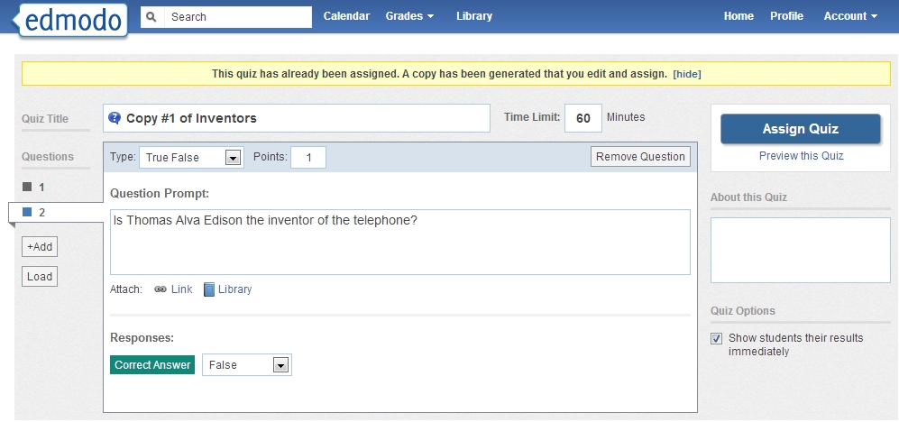 Es fácil preparar cuestionarios y preguntas de exámen para los estudiantes, incluso si son cronometrados. Hay cuatro tipos de preguntas para elegir: elección múltiple, verdadero o falso, respuestas cortas y rellenar los espacios en blanco. Las preguntas pueden ser organizadas, de tal forma, que puedan ser reutilizadas y modificadas incluso para otros grupos. El cuestionario final aparece en el foro del grupo, como otras tareas, pero también se pueden enviar preguntas a un estudiante específico, lo que significa que el sistema permite la diferenciación.