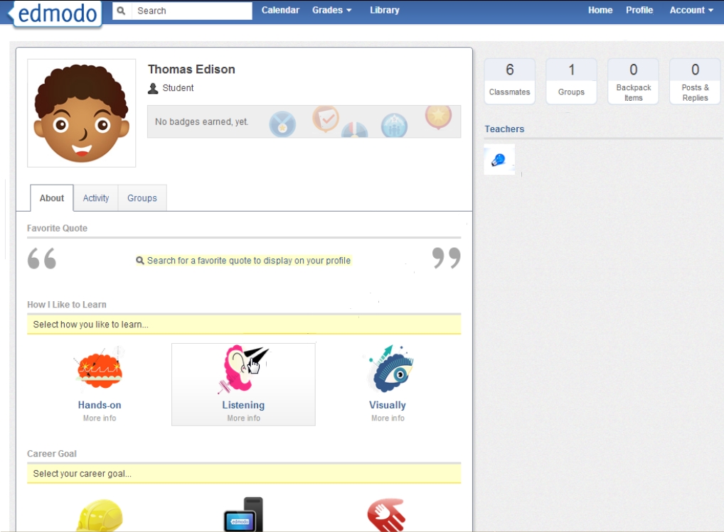 Los estudiantes pueden iniciar la sesión en el grupo creado por su profesor sin registrarse. Lo único es hacer clic en el botón de la página principal Edmodo "Yo soy un estudiante" e introducir el código de 6 dígitos que les da el profesor. Después de entrar, pueden modificar su perfil, introducir su dirección de correo electrónico, cargar su propia imagen y configurar una serie de ajustes. Lo más interesante de esta configuración es que pueden identificar su tipo de estudios (por ejemplo, visual, verbal) y elegir un campo específico. Después de entrar, los estudiantes obtendrán un código que pueden utilizar para invitar a sus padres al grupo.